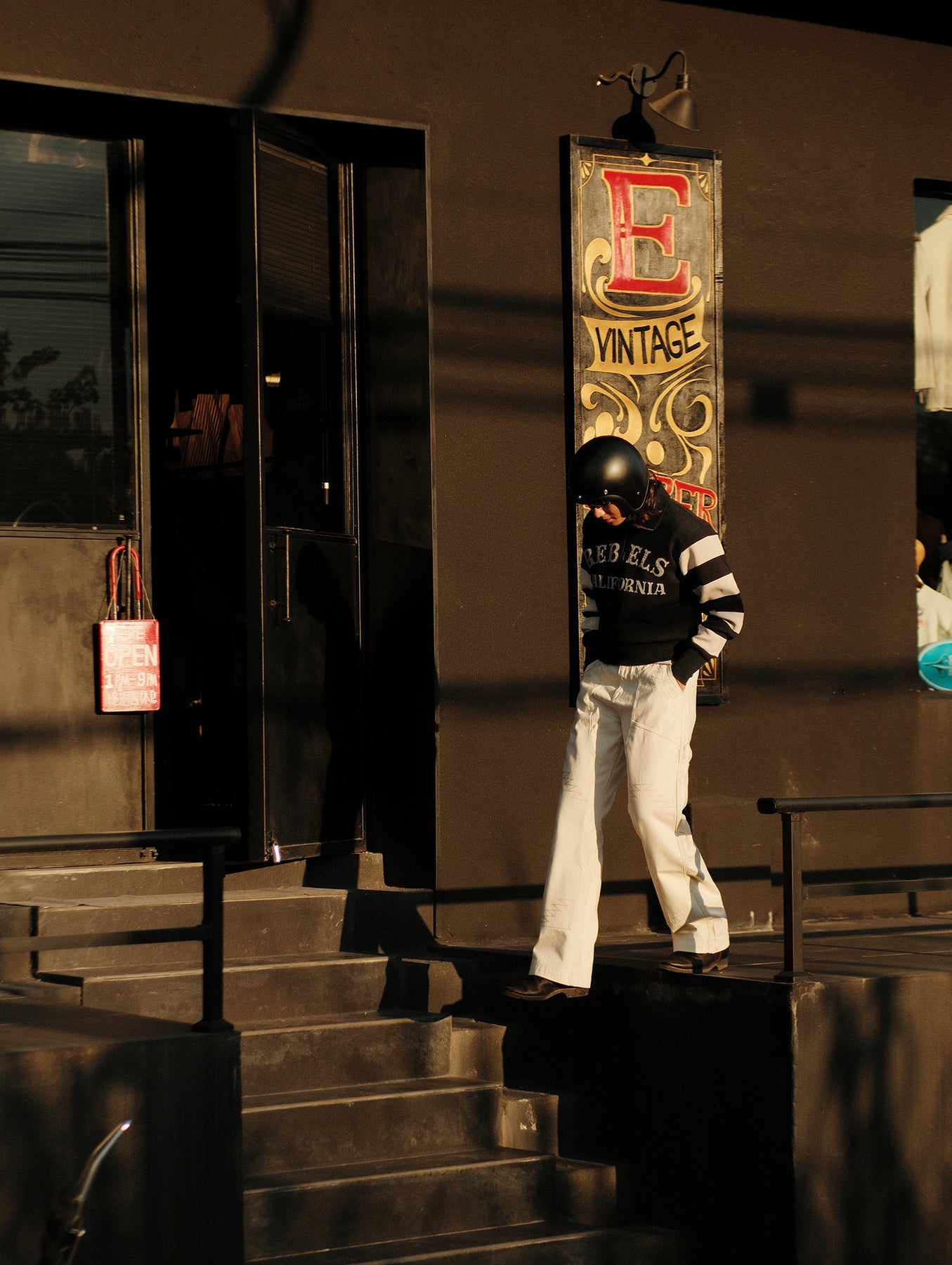 The overall style merges biker and prison-inspired aesthetics, with the bold black-and-white stripes on the sleeves echoing the iconic look of inmate uniforms.