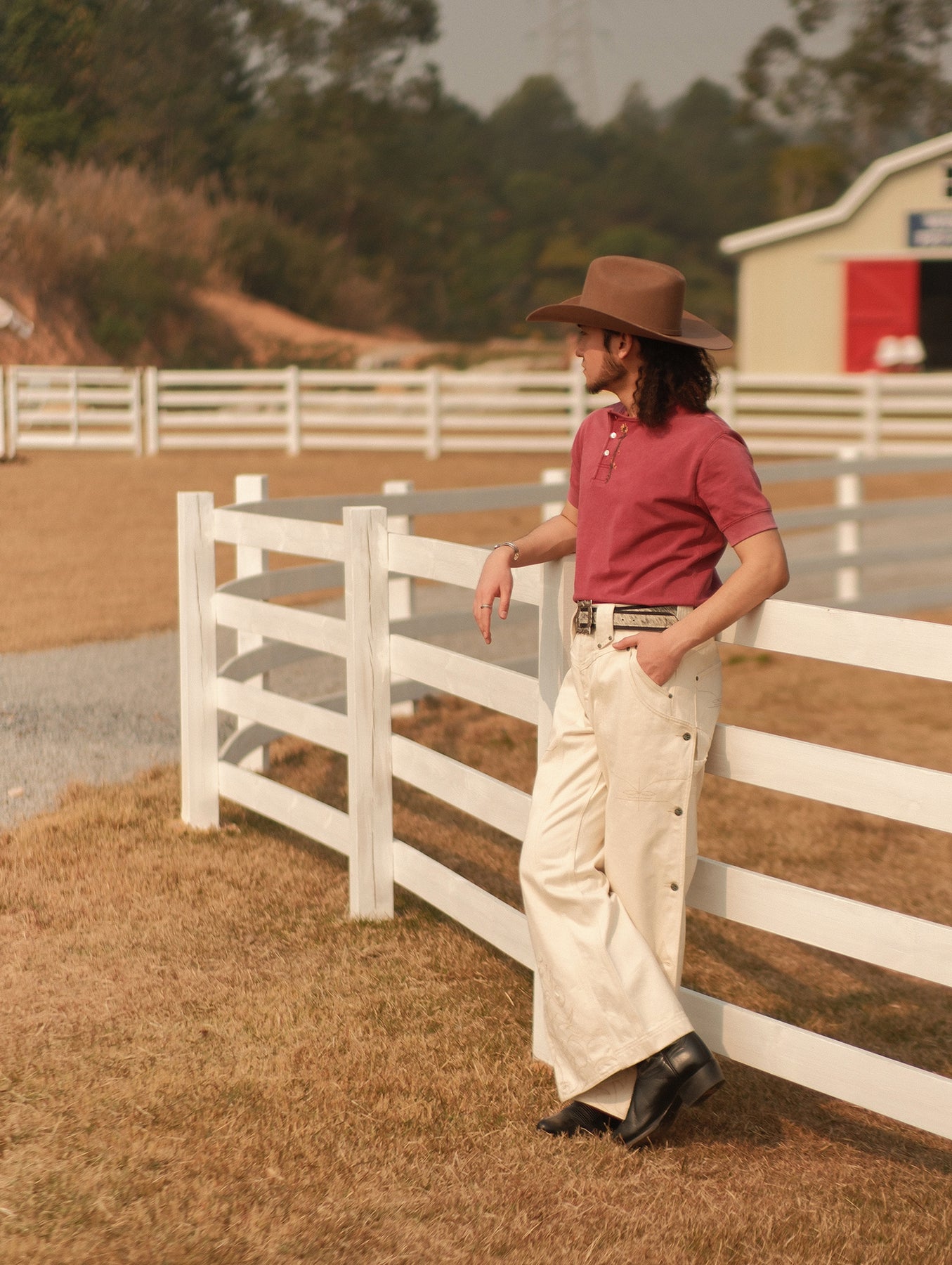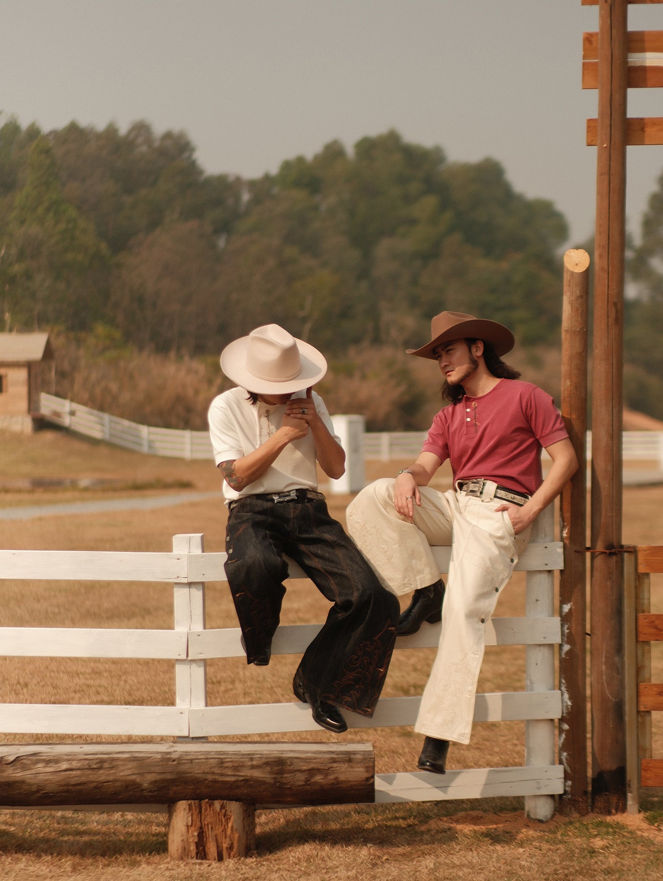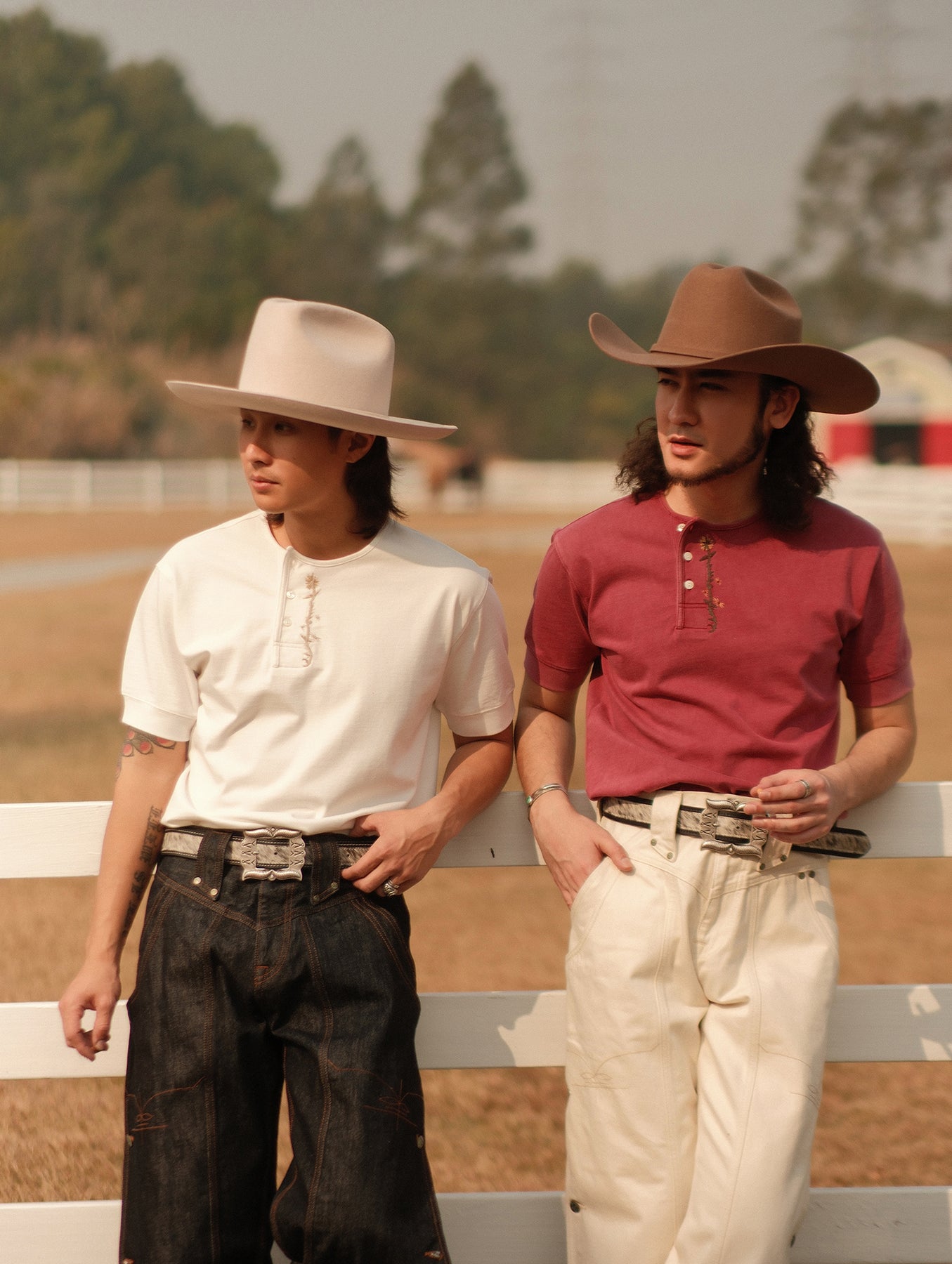 Western Series Floral Embroidered Henley T-shirt-Sun-faded Red