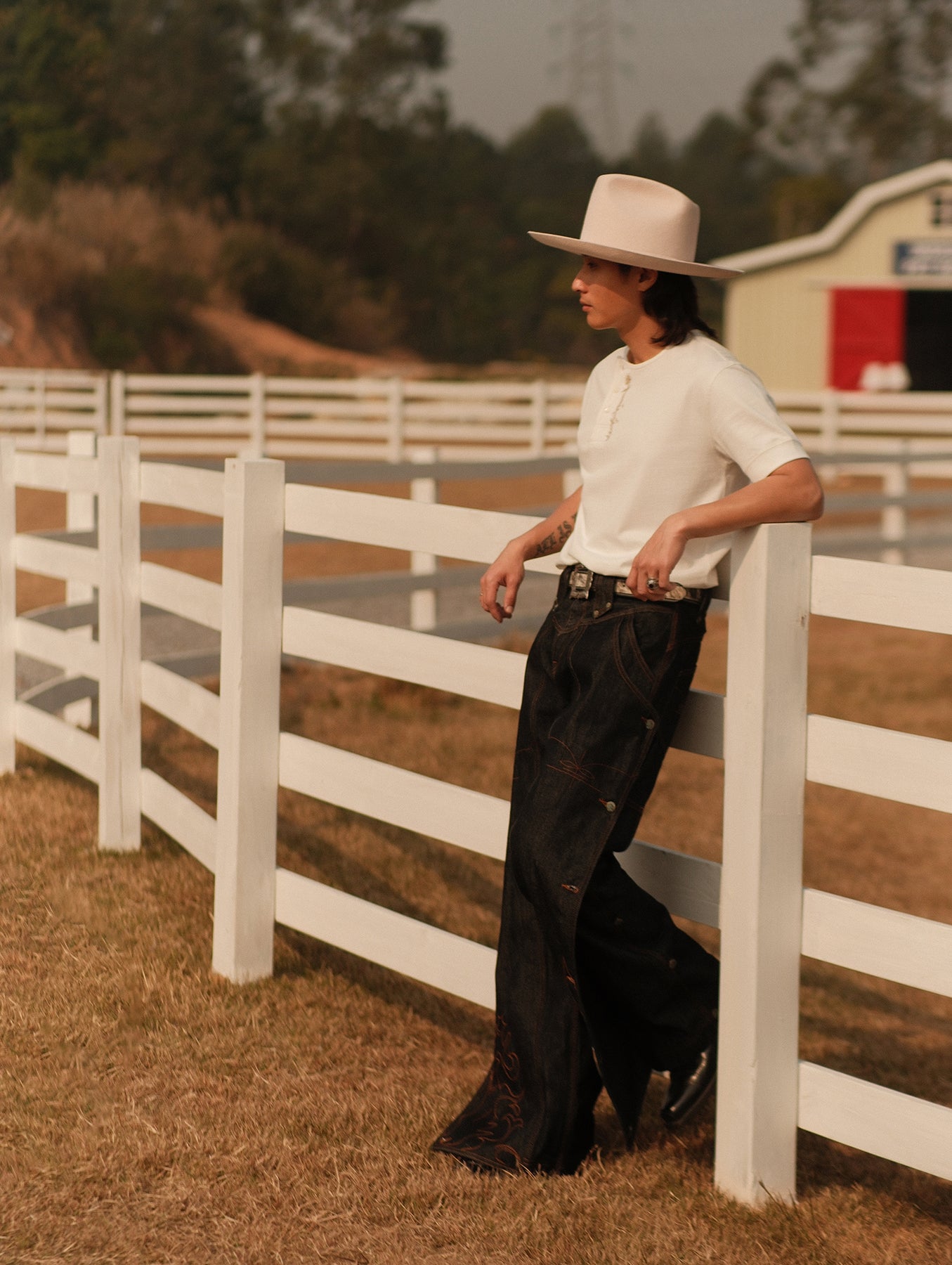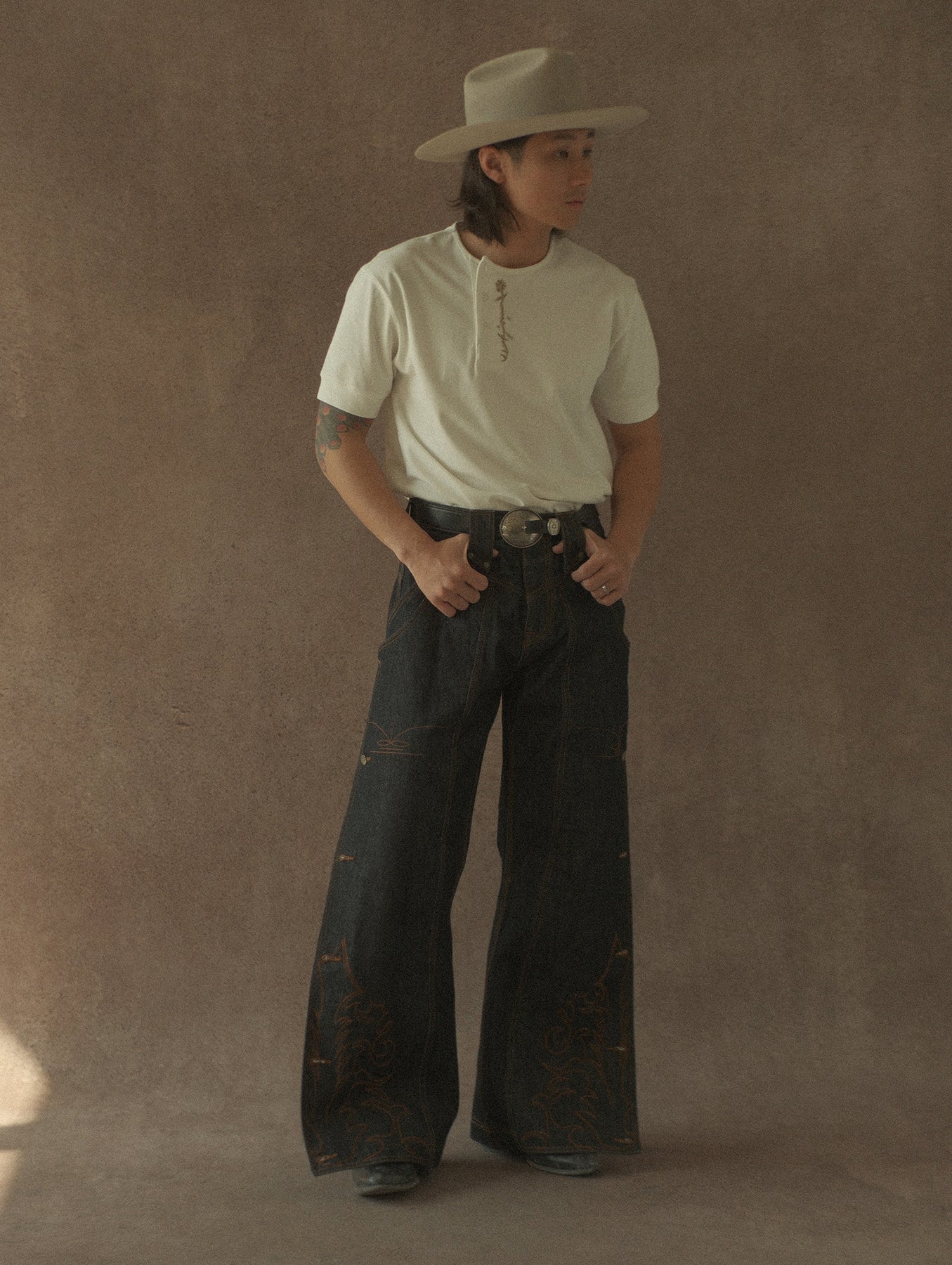 Fabric and embroidery complement each other, creating depth through detail while remaining restrained.