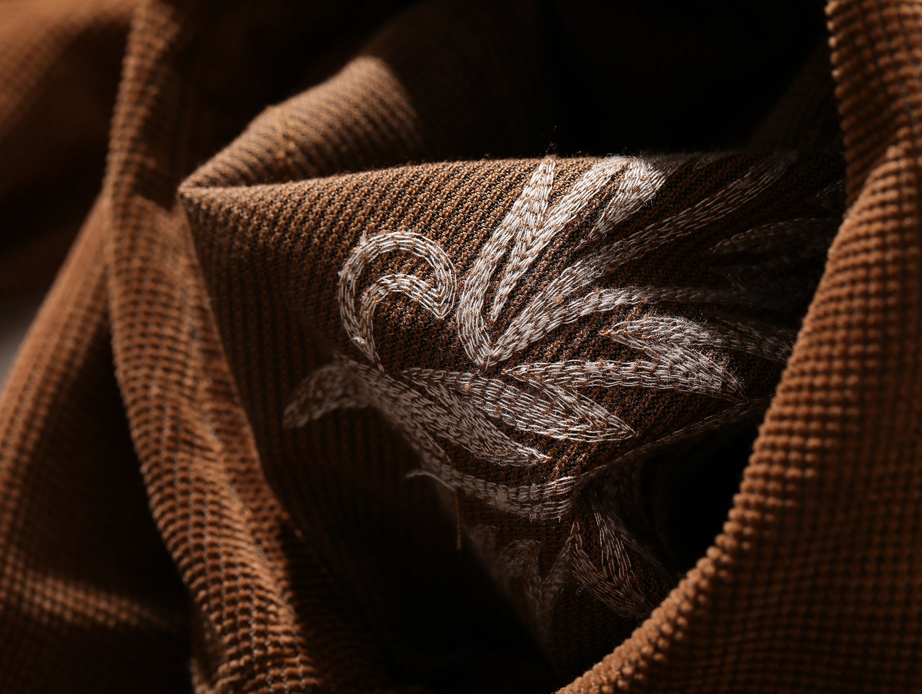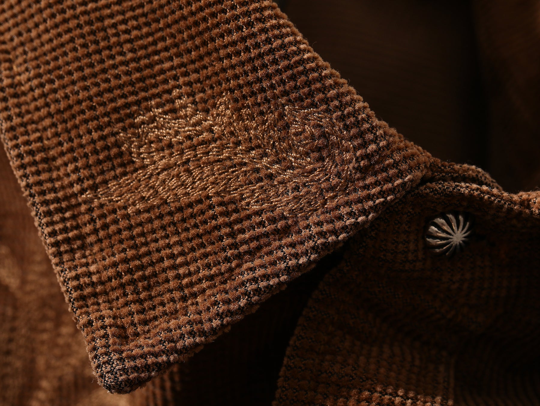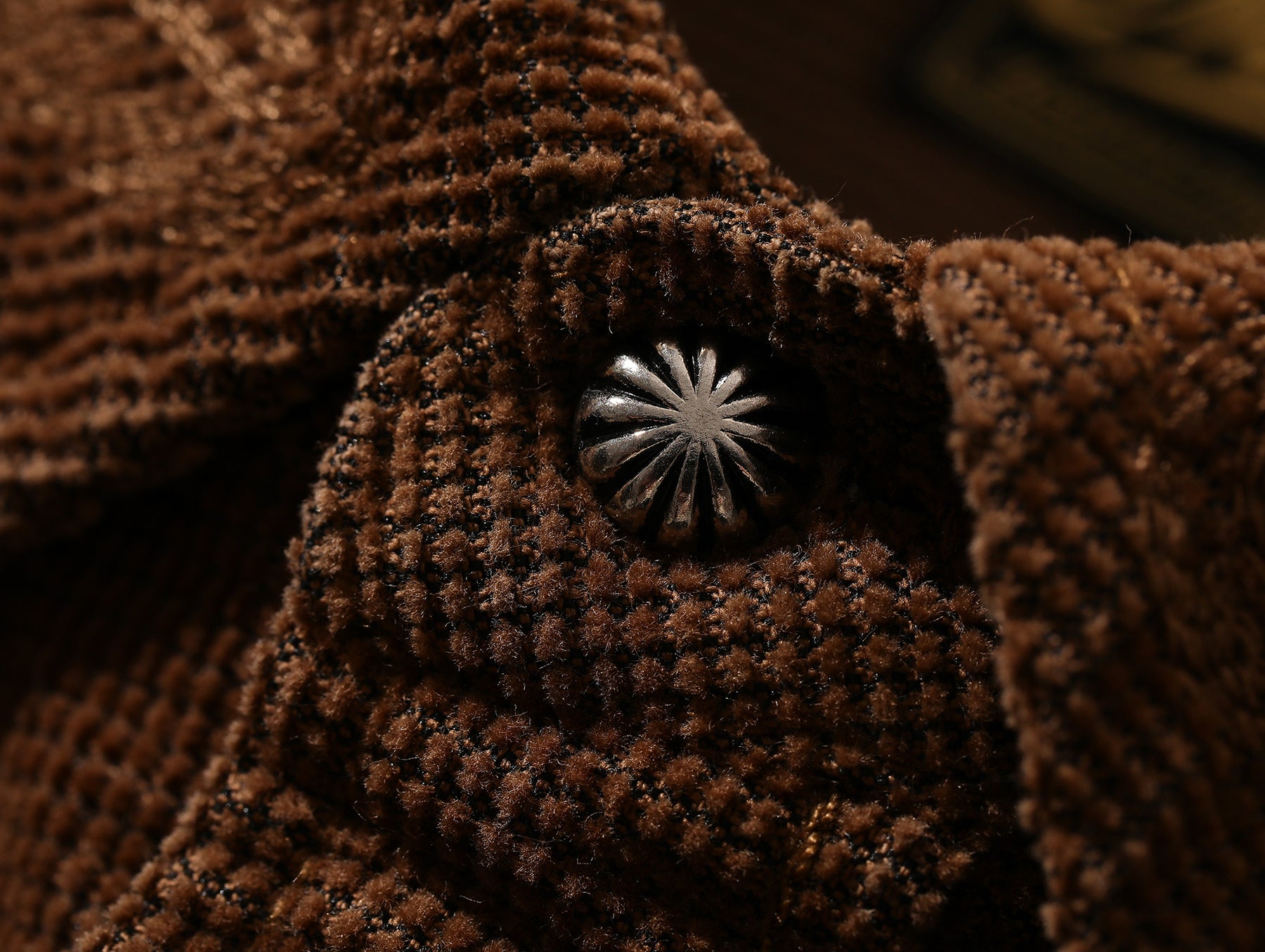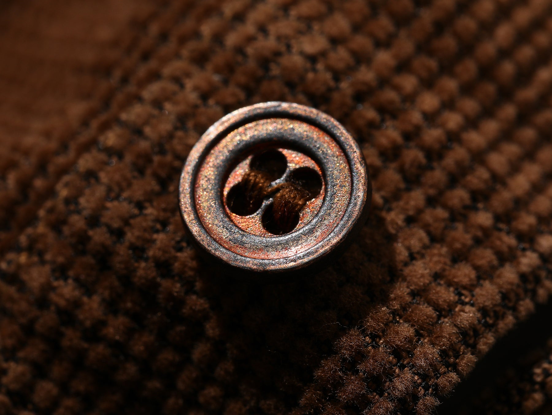 The buttons are custom-made with a rust-effect metal finish, harmonizing seamlessly with the fabric’s aesthetic.