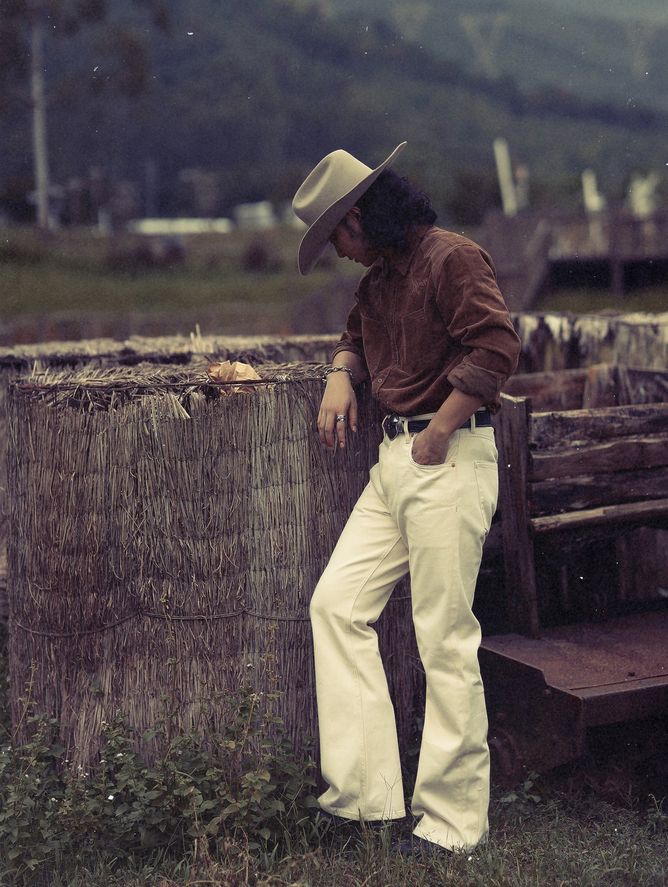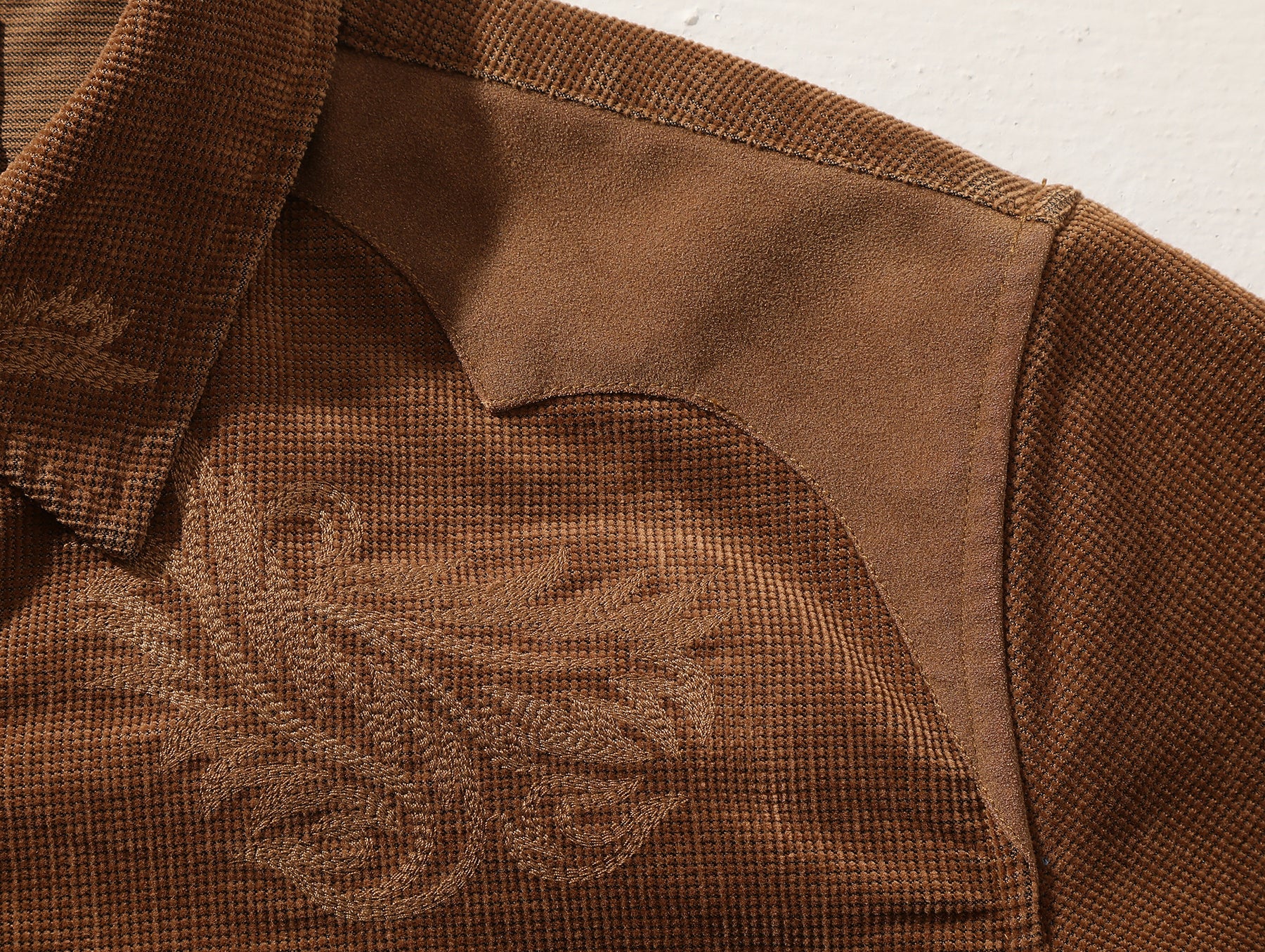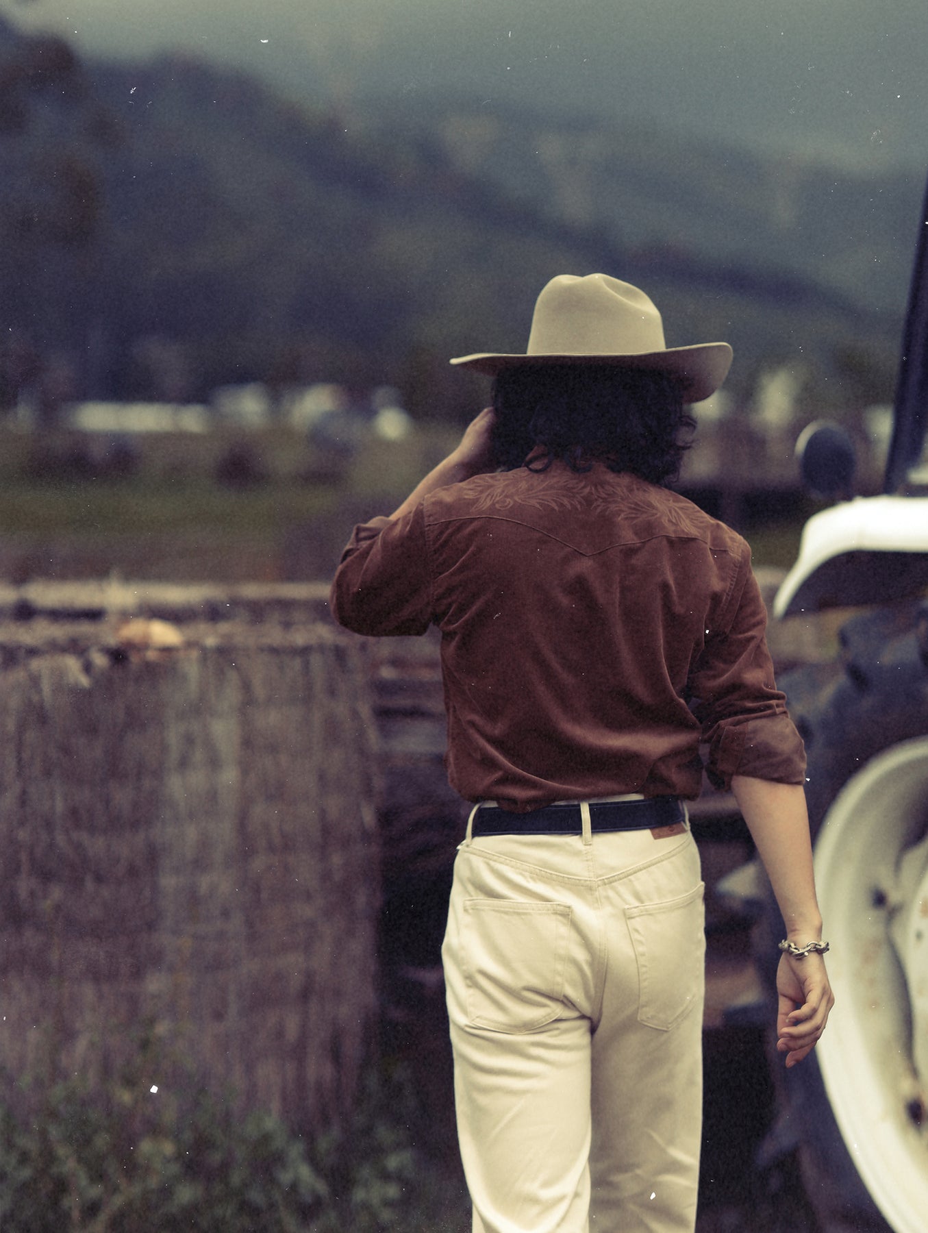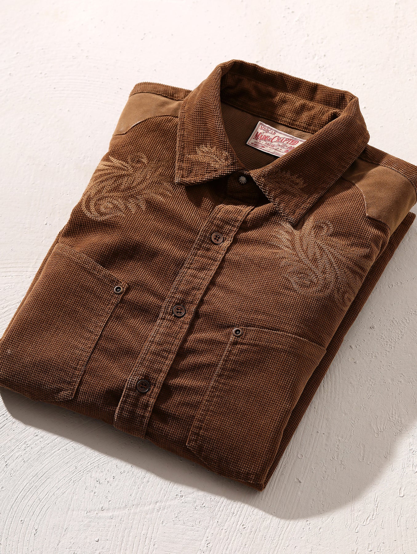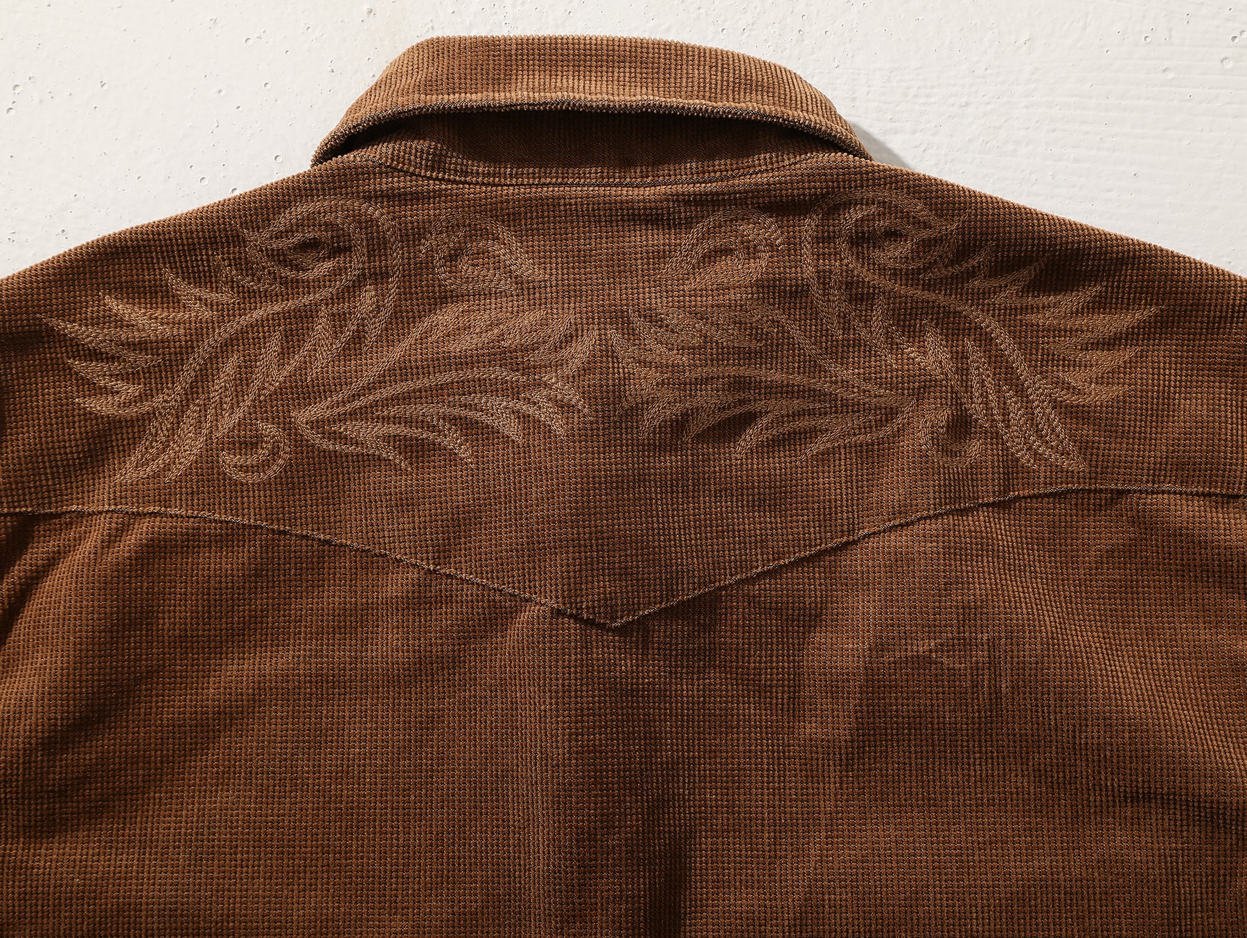The buttons are custom-made with a rust-effect metal finish, harmonizing seamlessly with the fabric’s aesthetic.