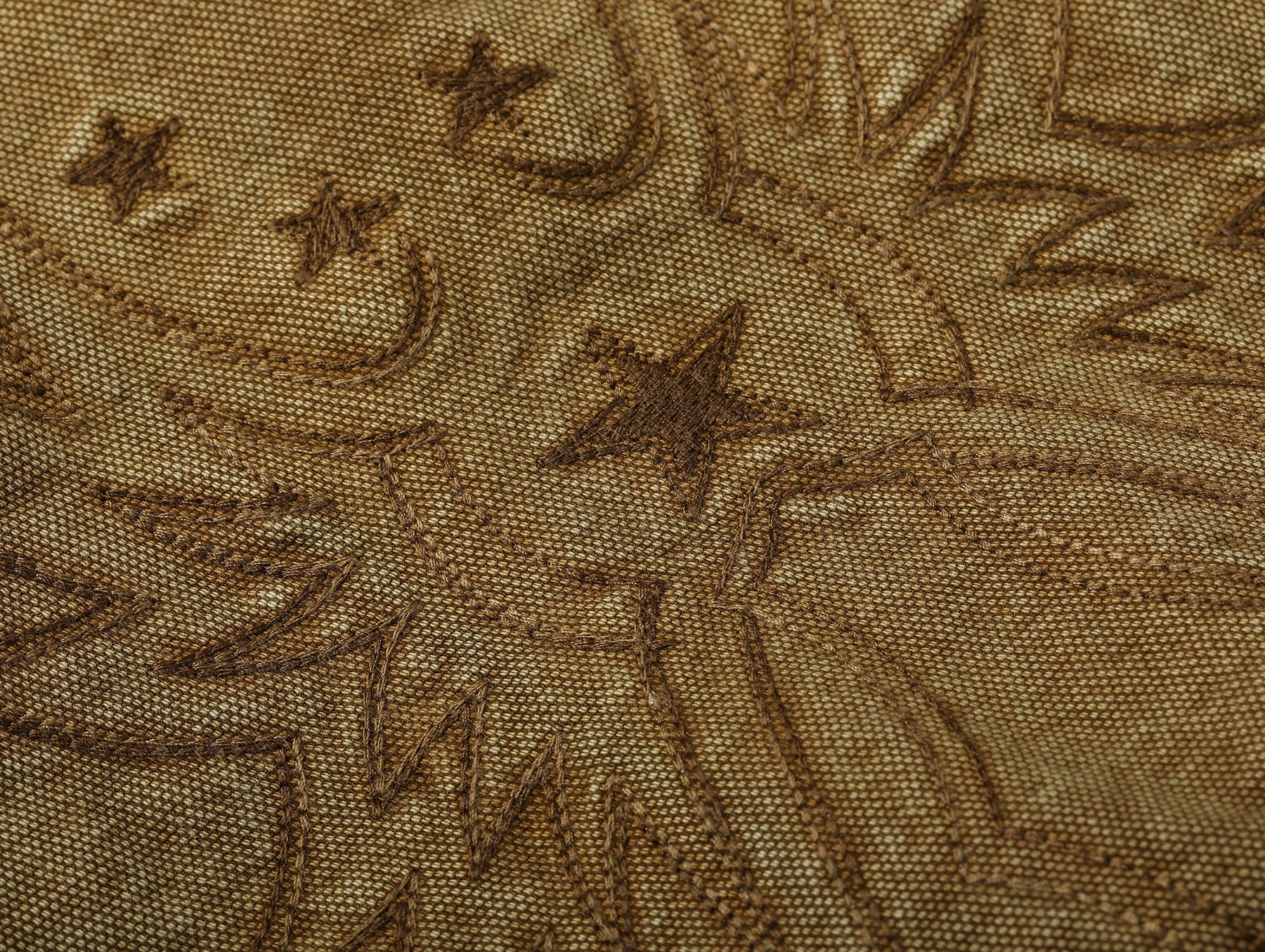 Both front and back pockets feature small-scale, detail-rich embroidery.