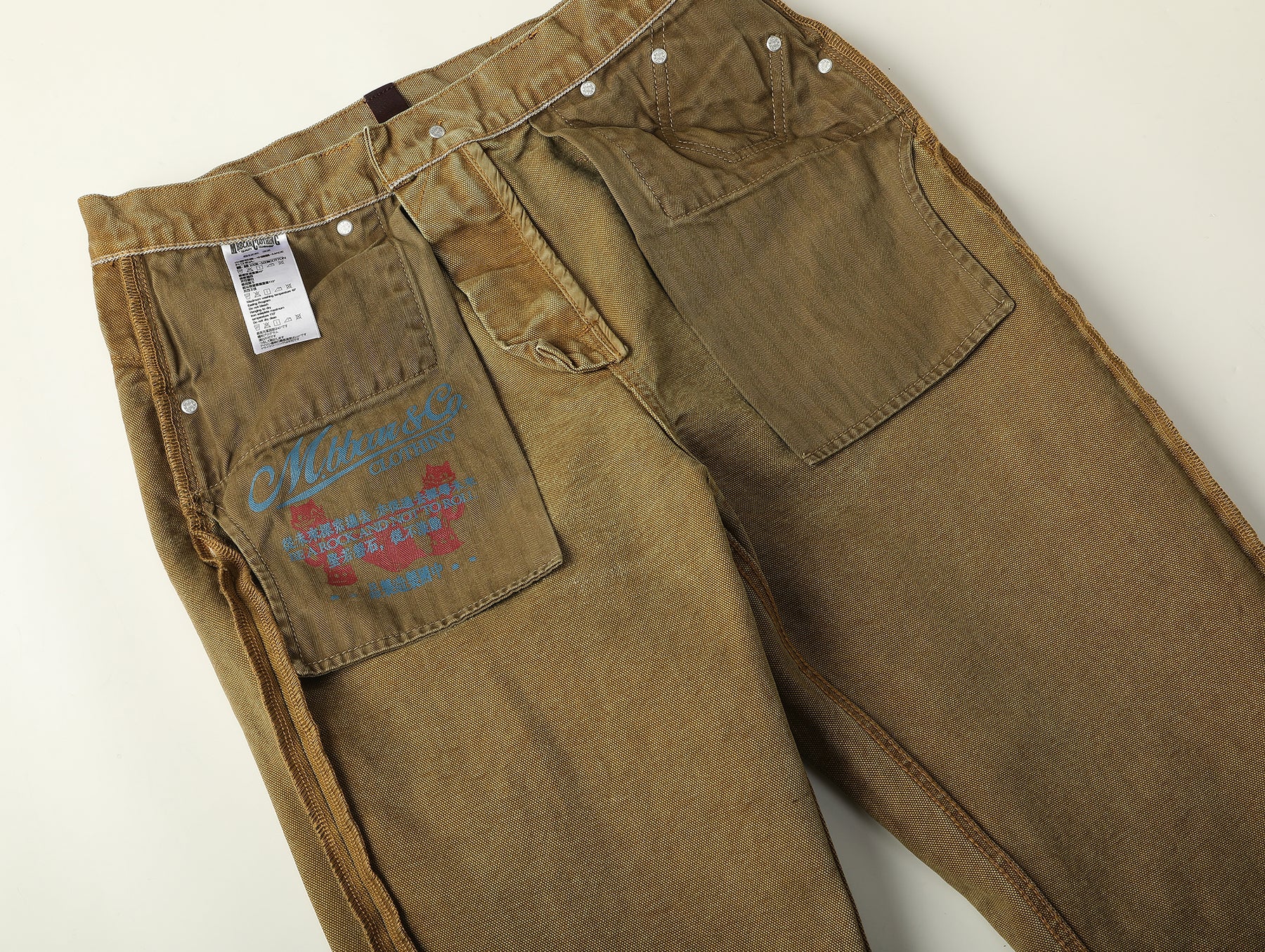 The fabric is garment overdyed on greige cloth, followed by multiple washing processes to achieve an earthy, clay-like tone with subtle rubbed-in dirt effects.