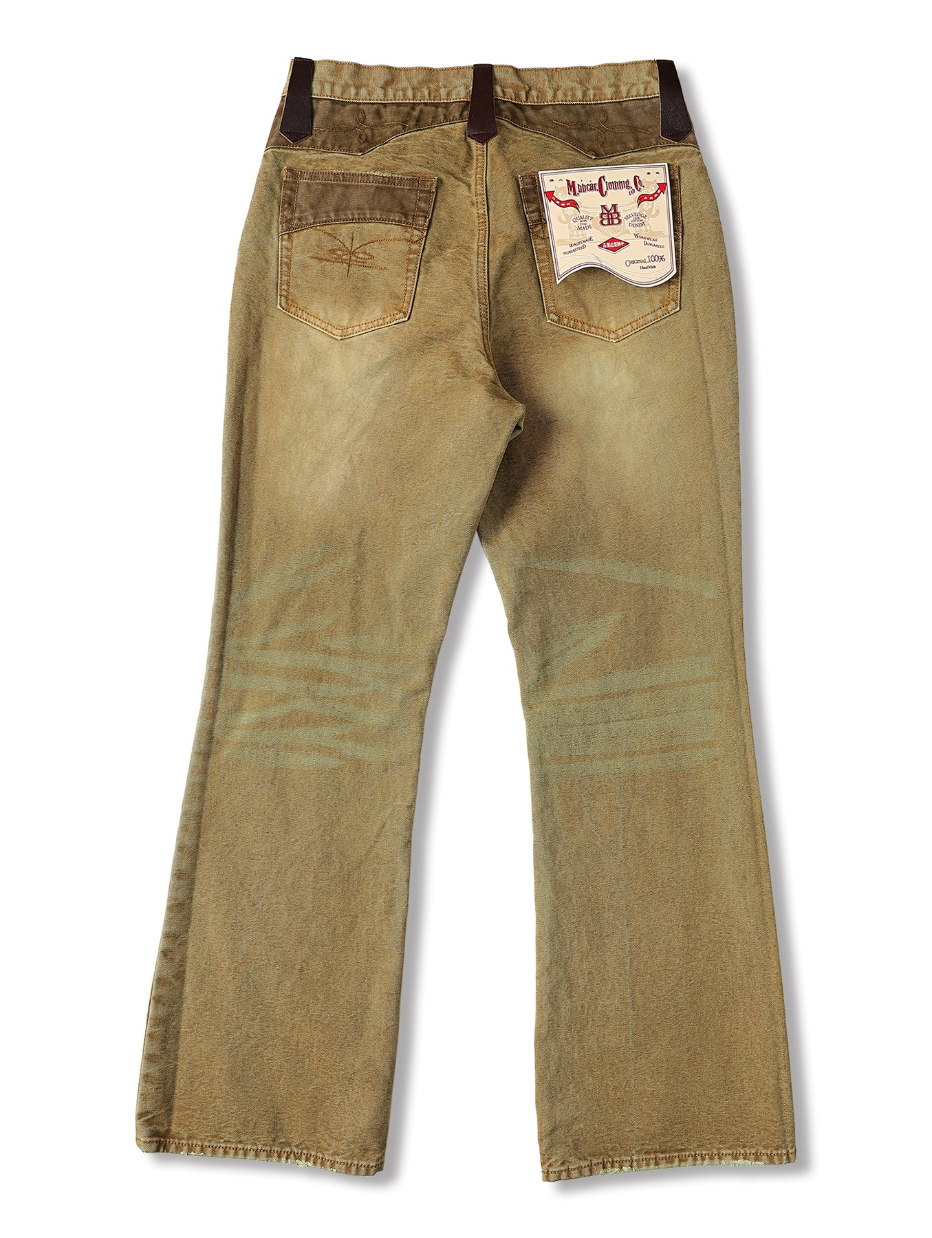 Western-inspired arabesque seed embroidery runs along the leg, echoing classic patterns found on cowboy boot shafts.