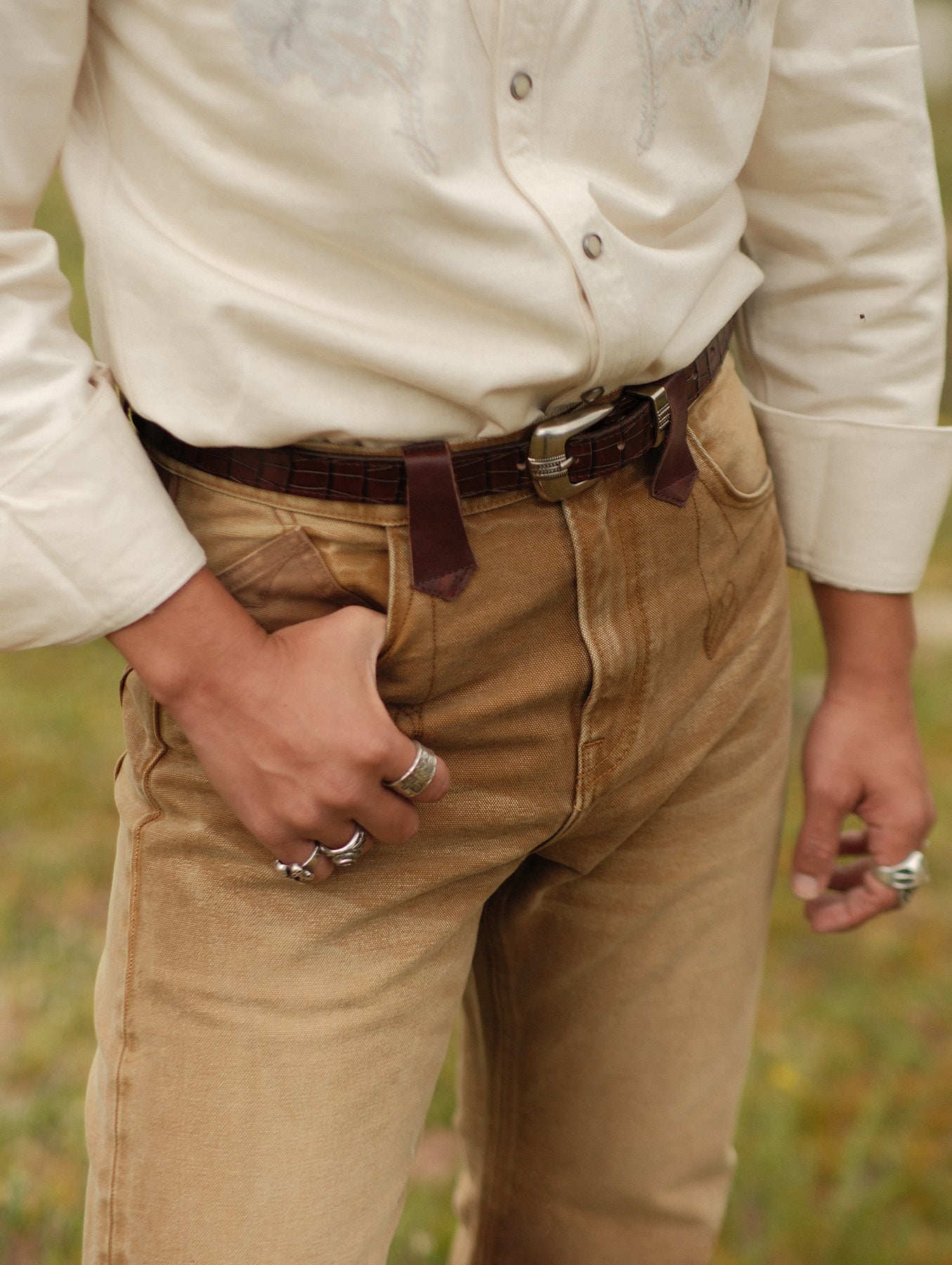Belt loops are finished with full-grain cowhide, reinforcing durability while adding a refined material contrast.