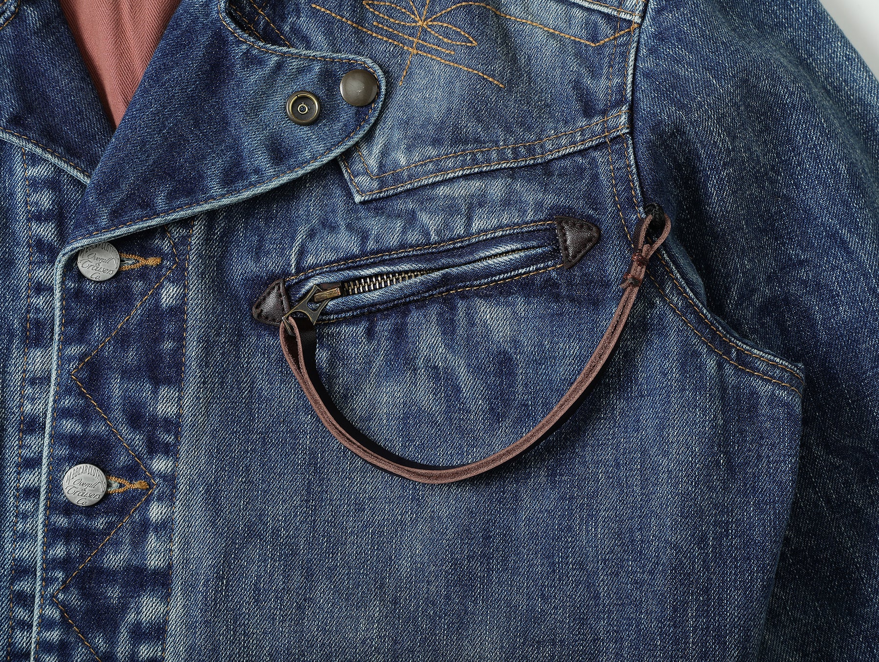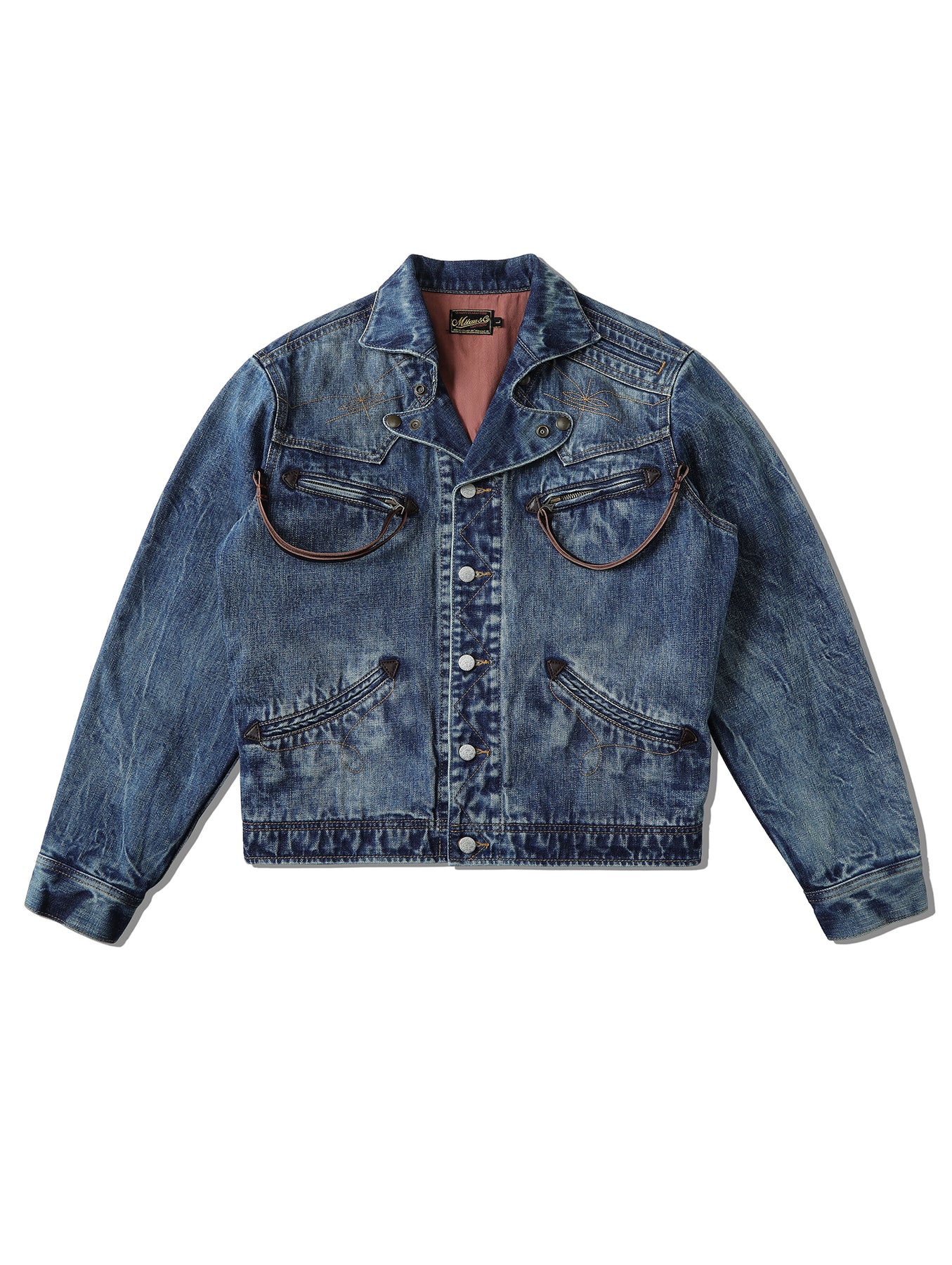 Genuine leather zip pulls and triangular leather patches add a modern police rider aesthetic.
