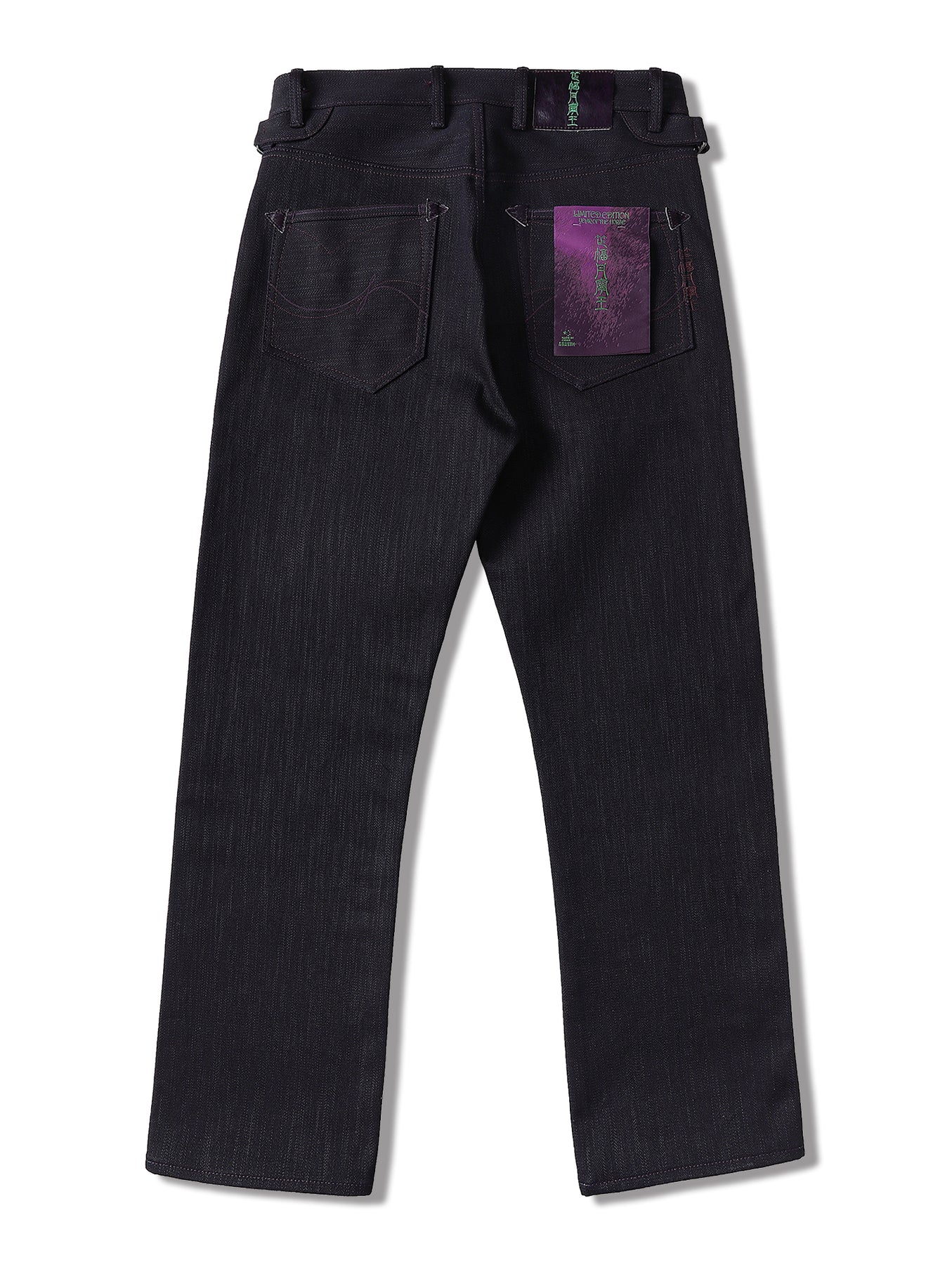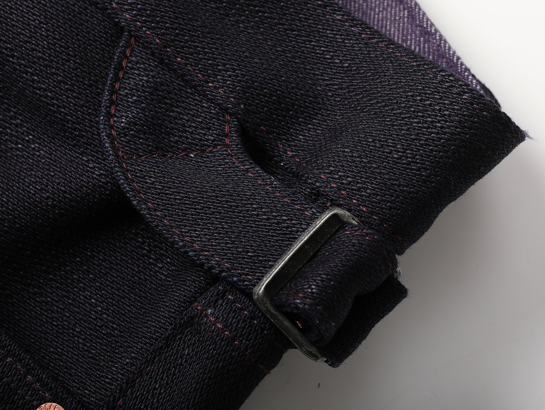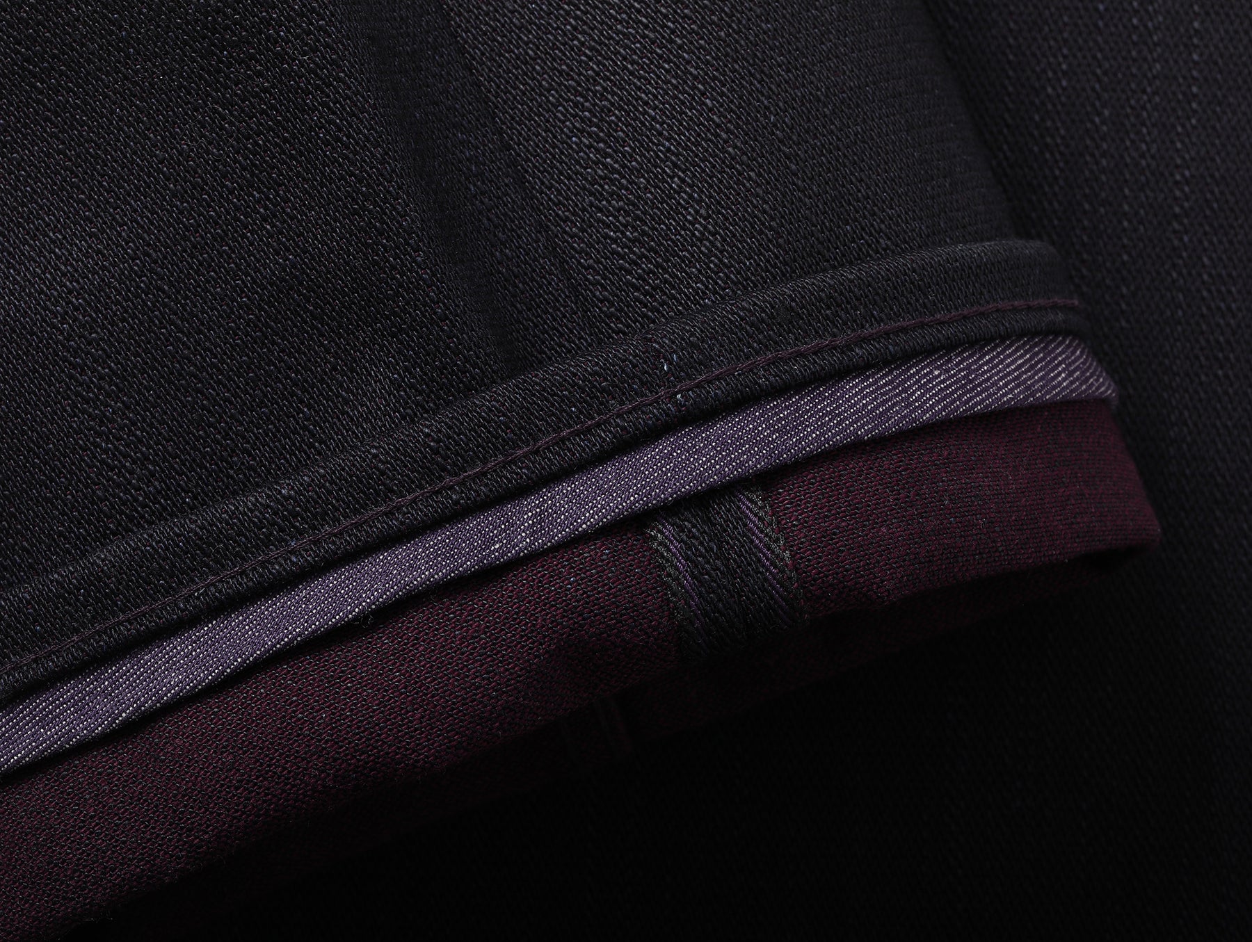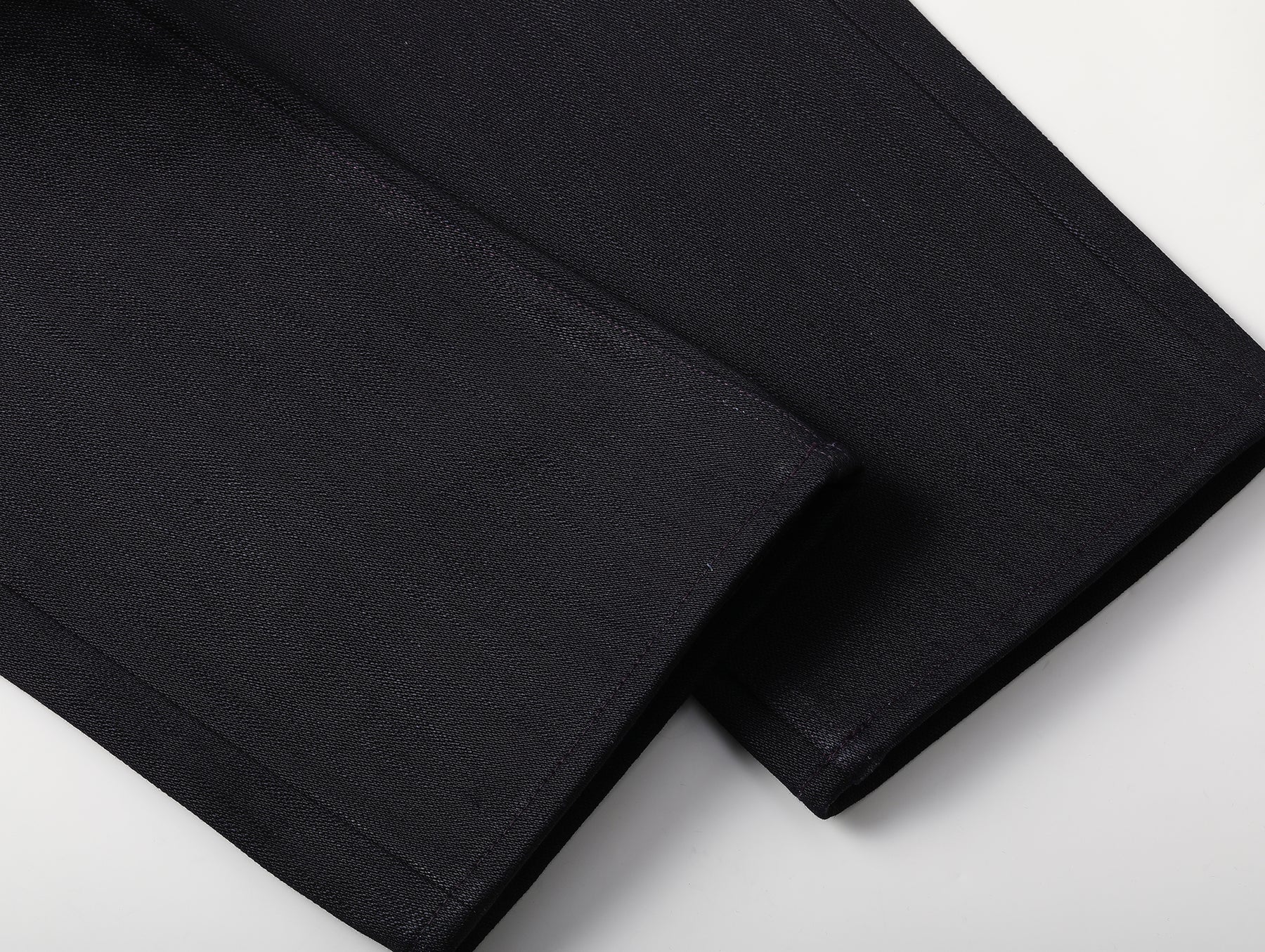 Dyed with an ultra-deep indigo, the subtle purplish cast of the fabric comes from the interaction between the weft yarns and purple slub fibers.