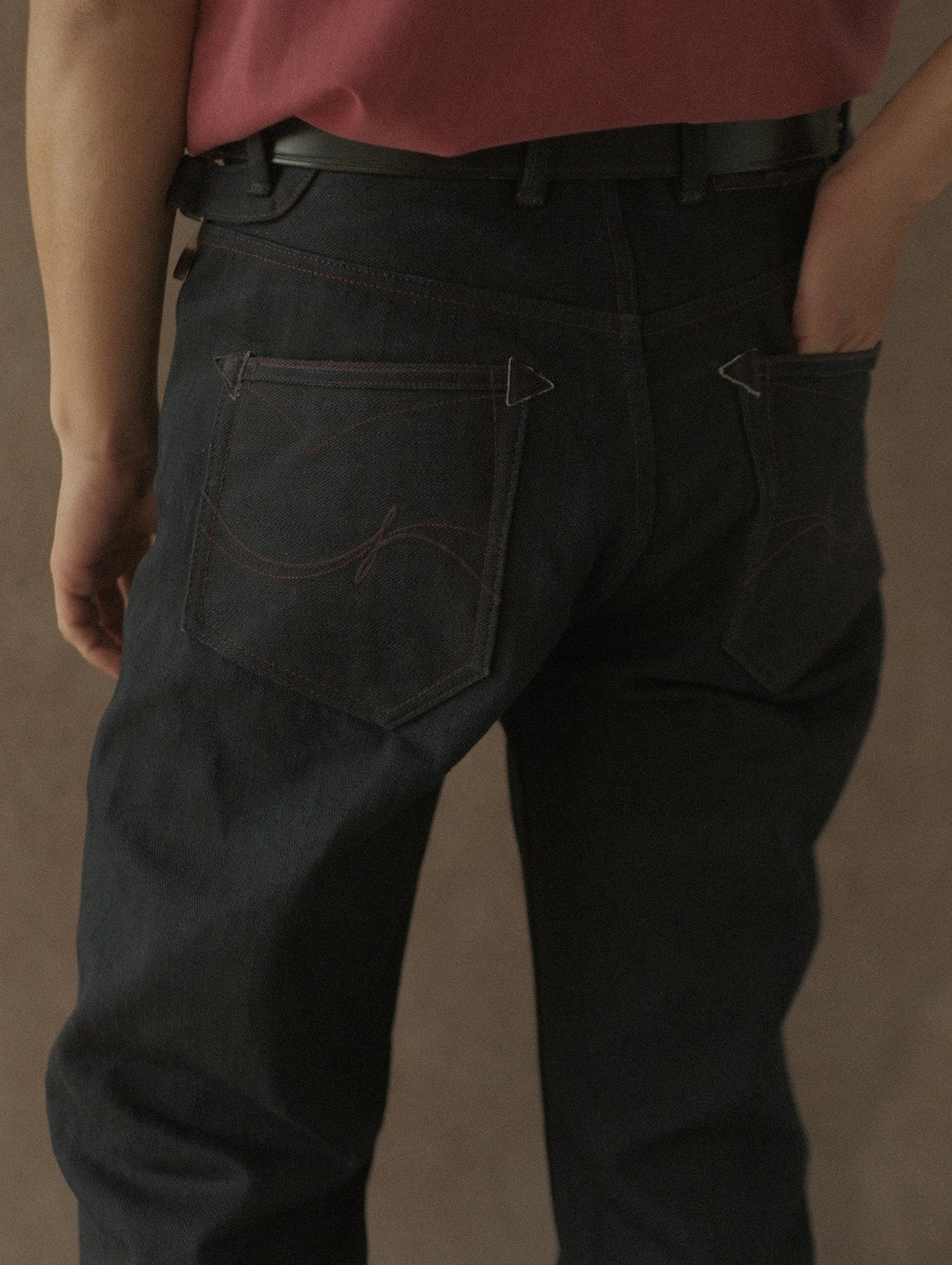 As the denim fades with wear, these tones gradually emerge, revealing a restrained crimson sheen reminiscent of the legendary “Ferghana horse” — never obvious at first glance, but quietly revealed over time.
