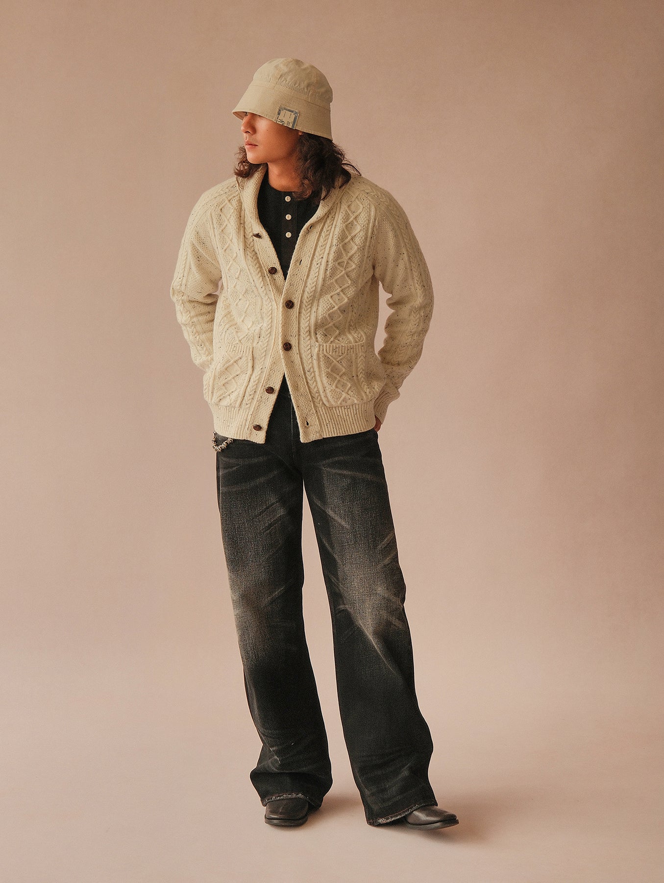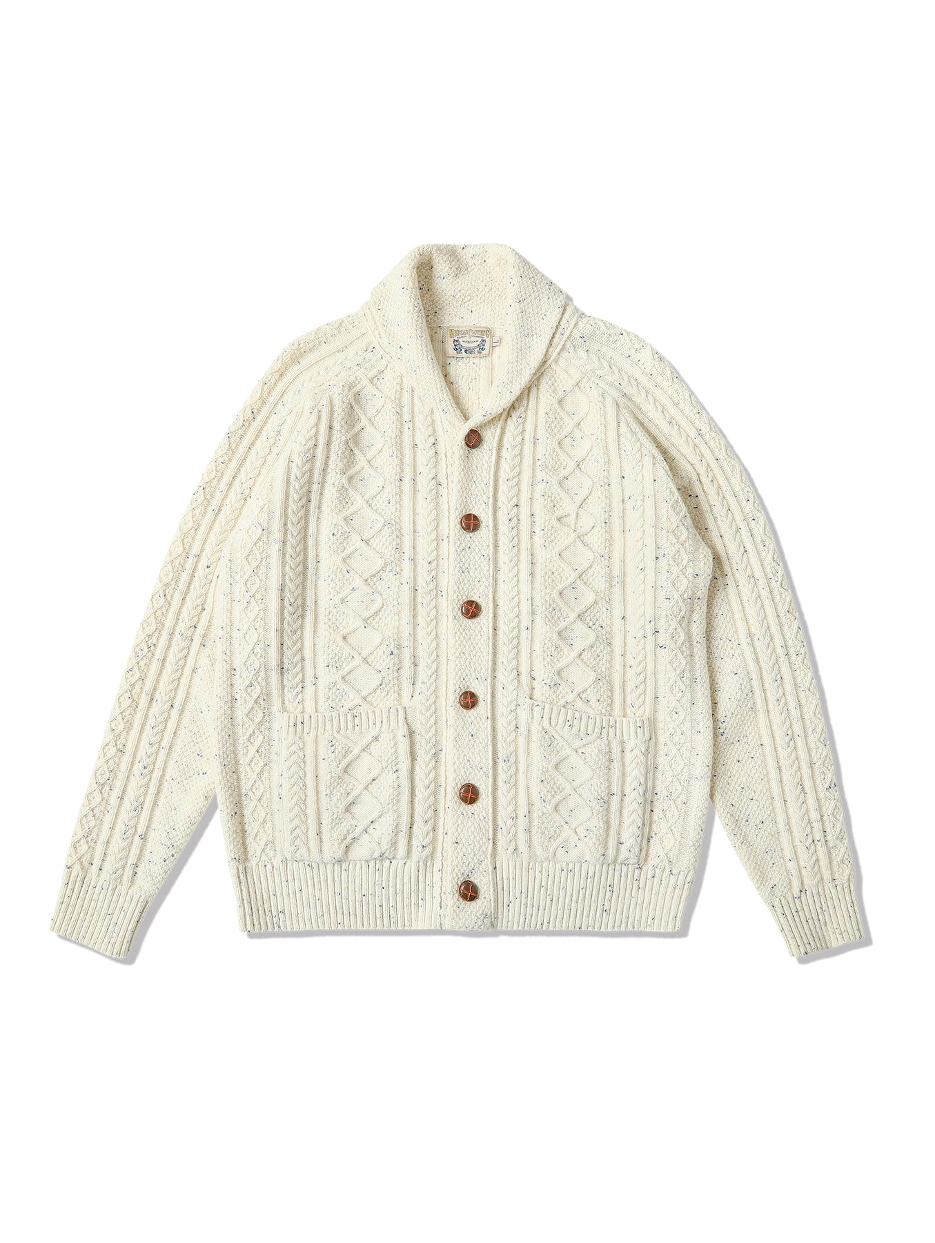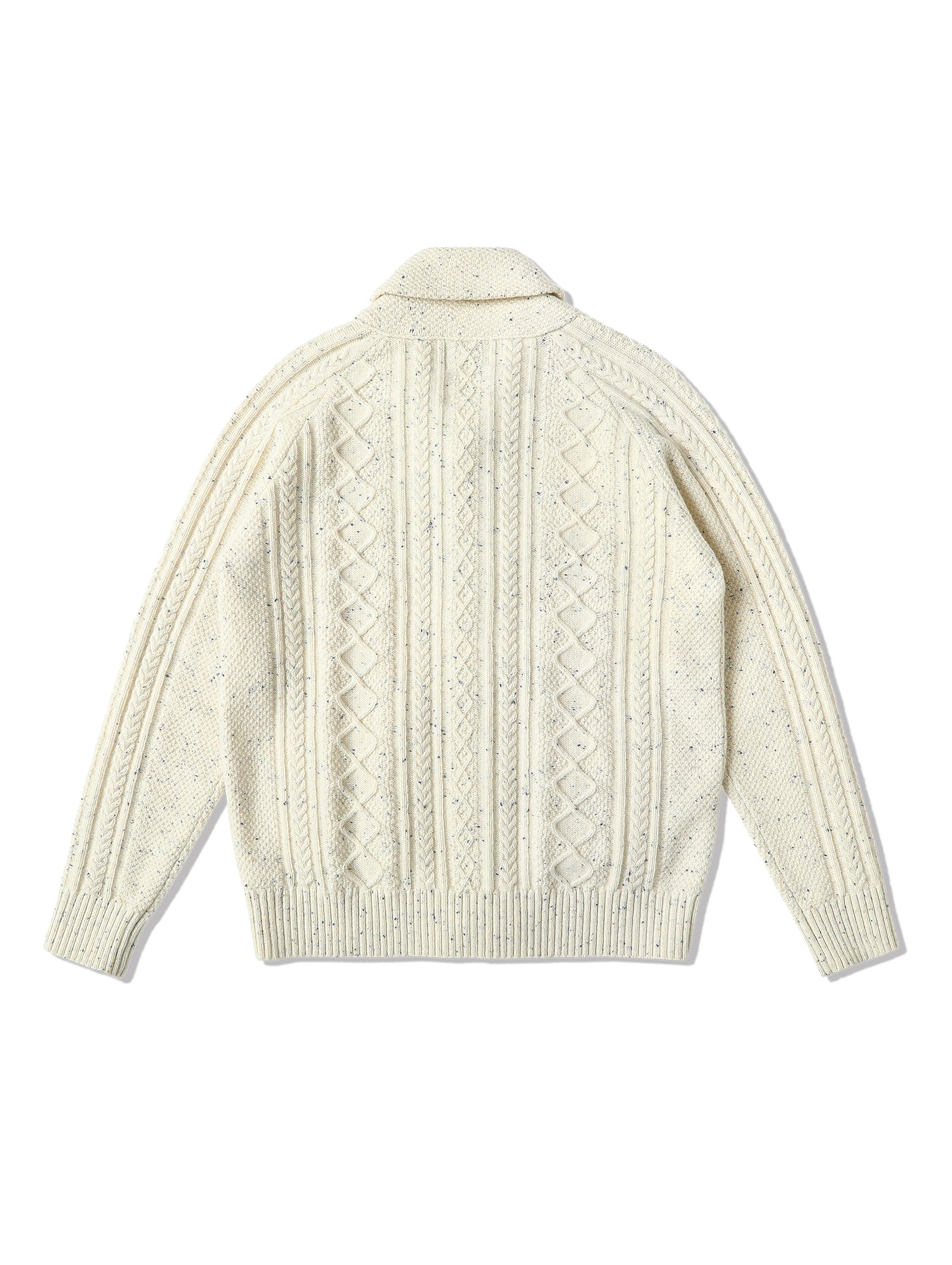 The diamond cable knit pattern complements the shawl collar perfectly.
