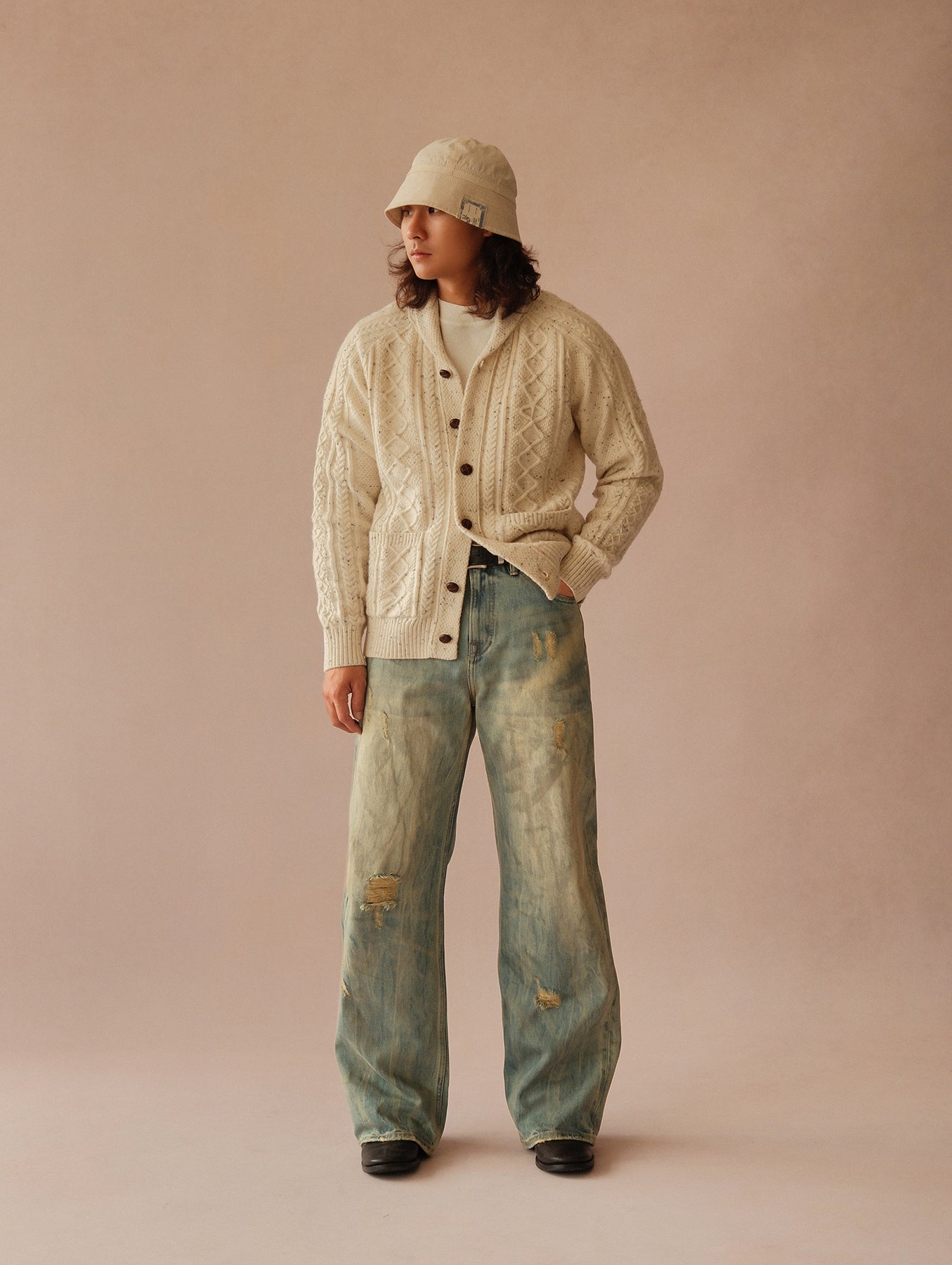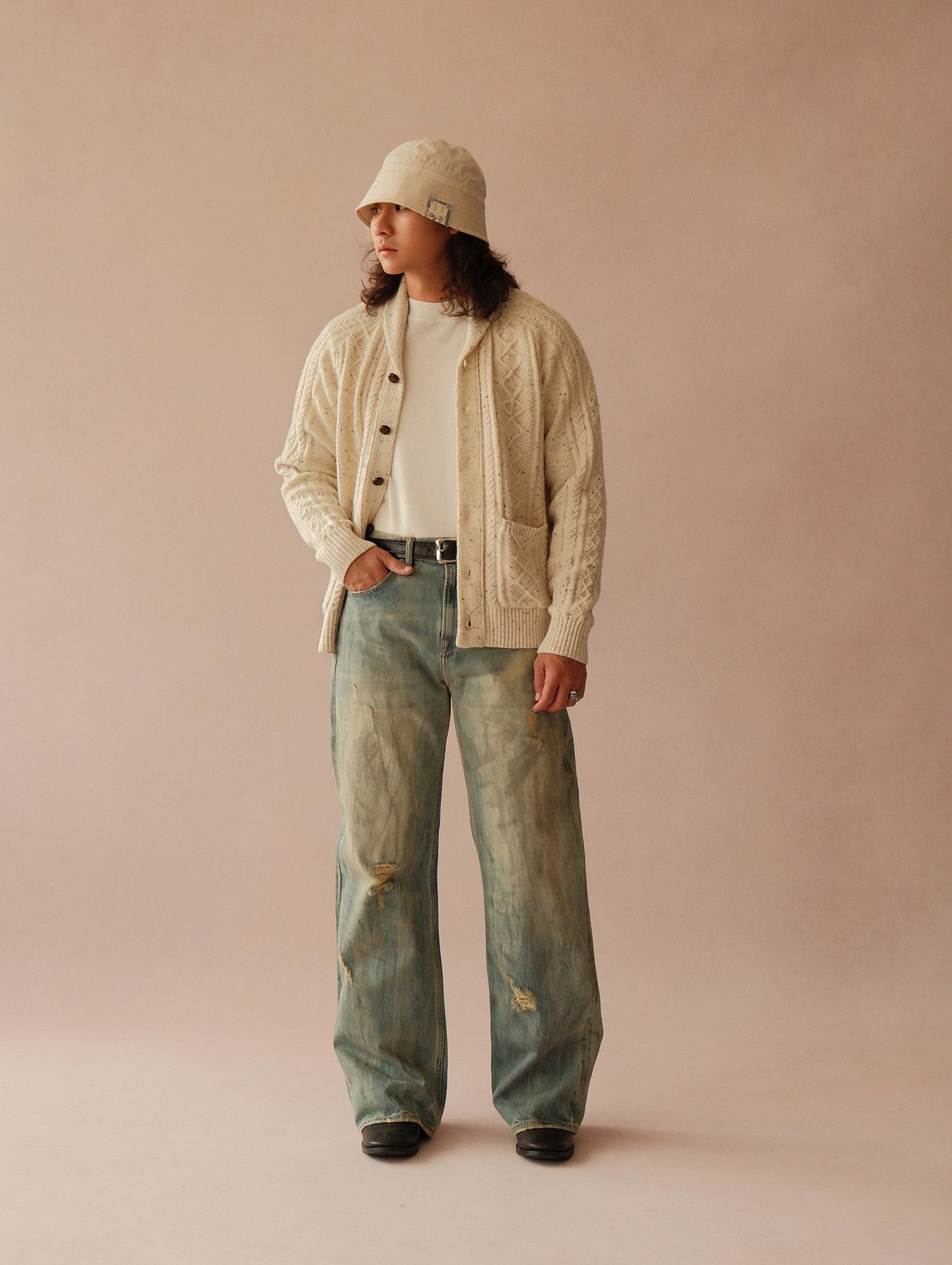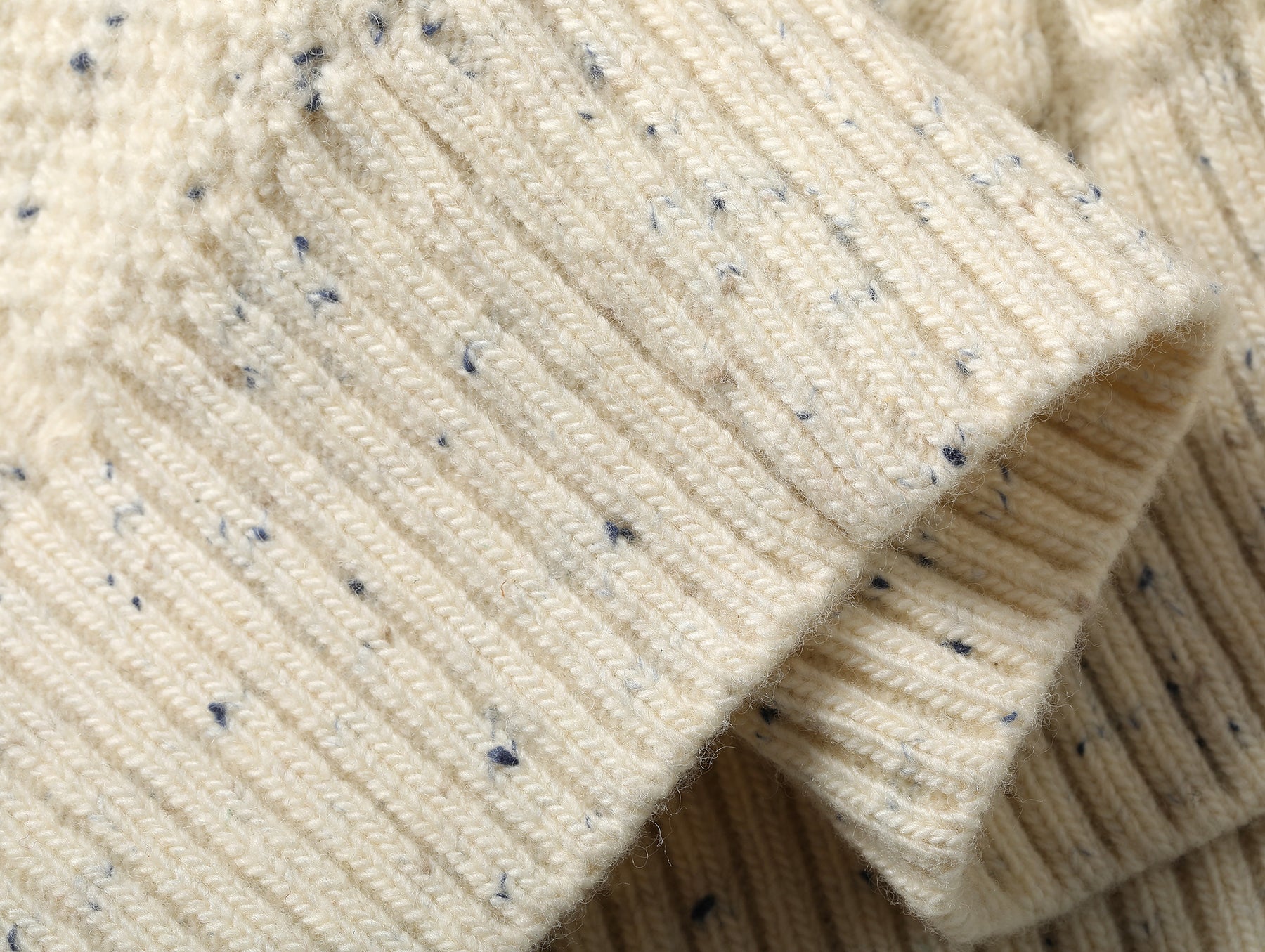 Crafted from custom-made heather yarn, featuring a mid-white base with subtle blue-grey flecks.