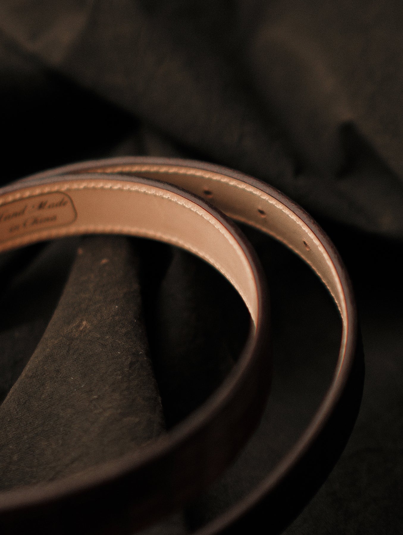 The stitching is executed with precision machinery for consistency, while the inner side of the belt features a pattern applied by hand using hot foil stamping.